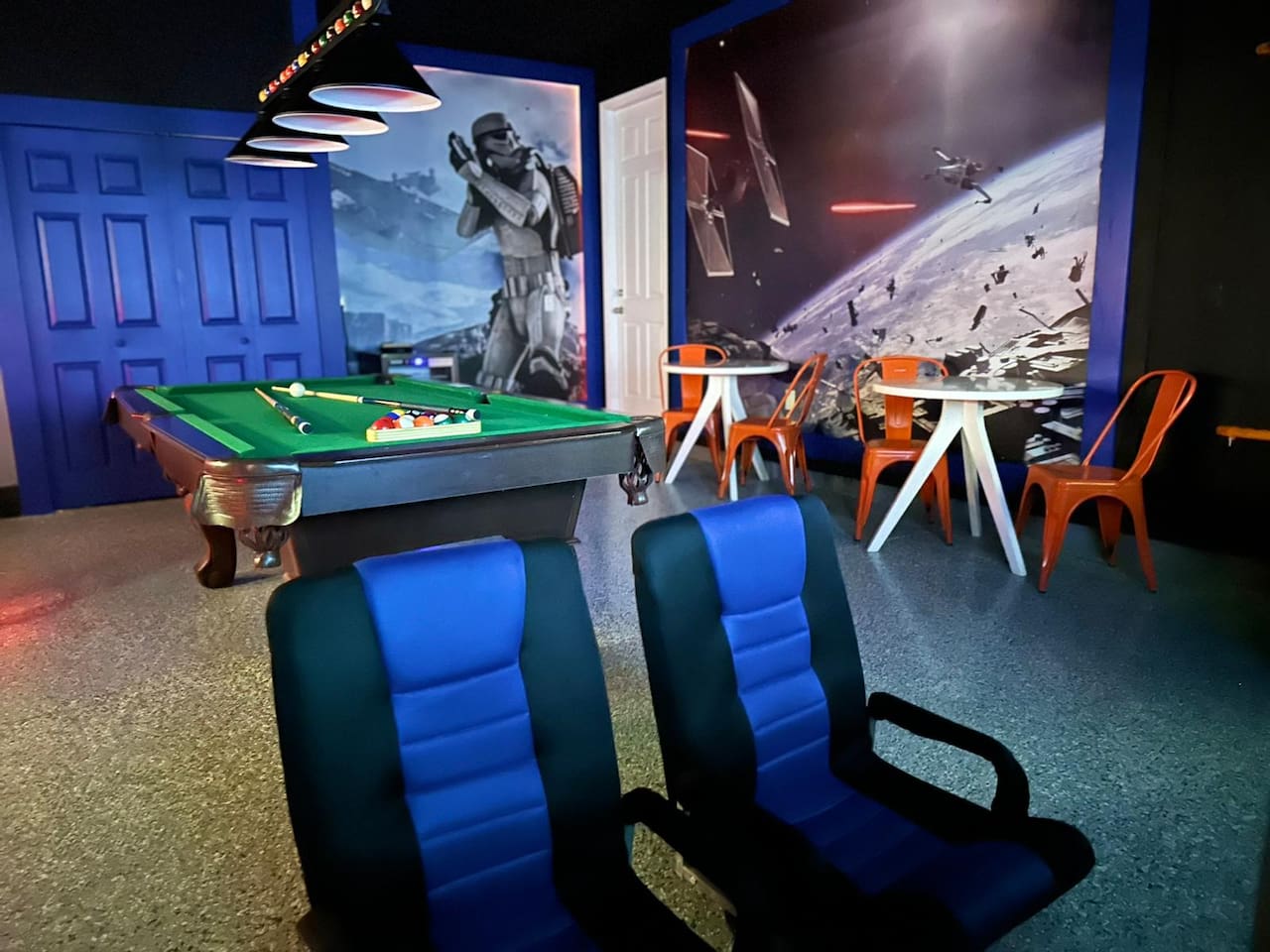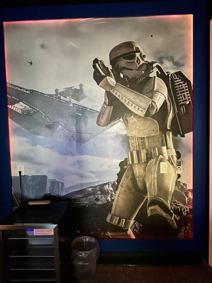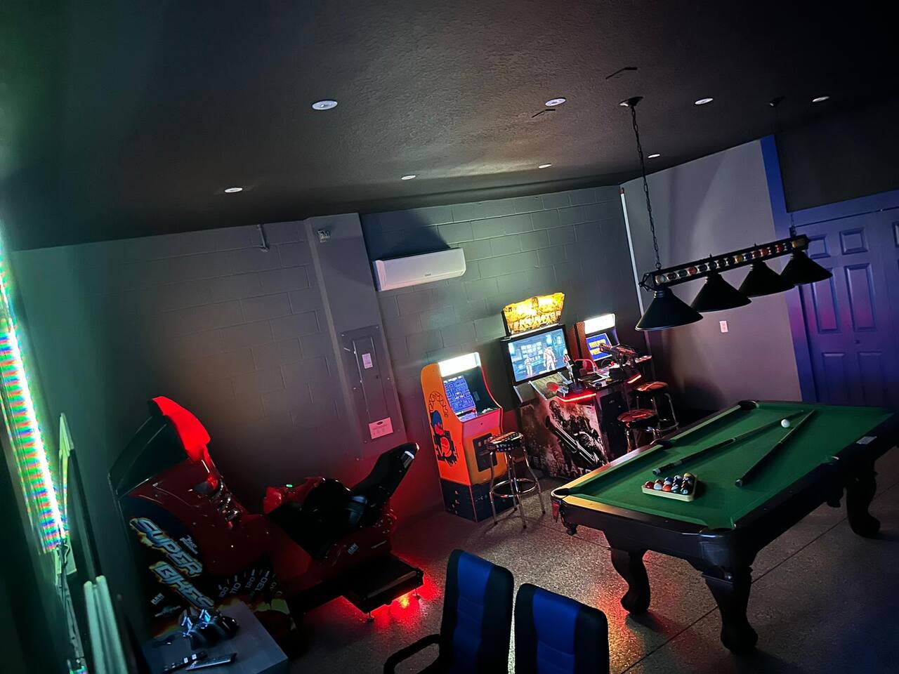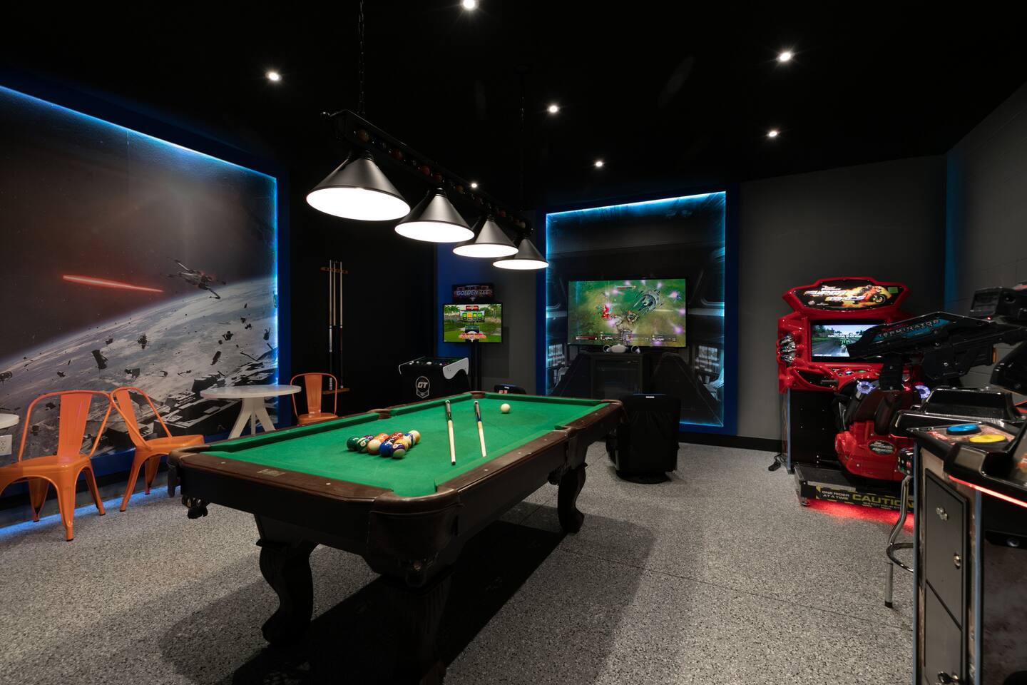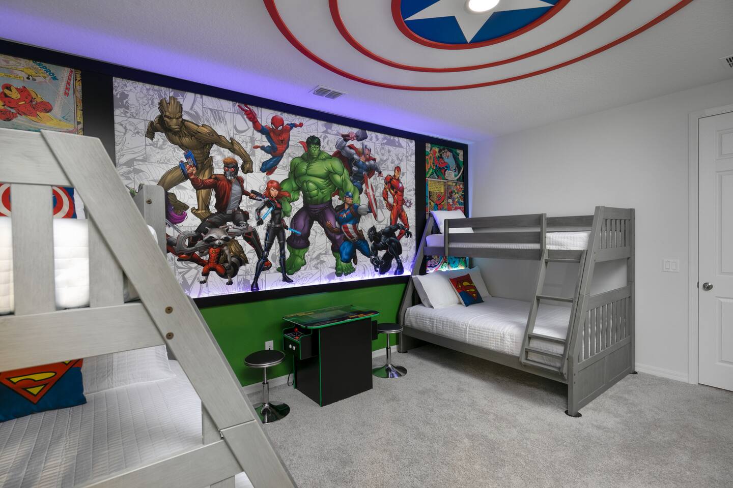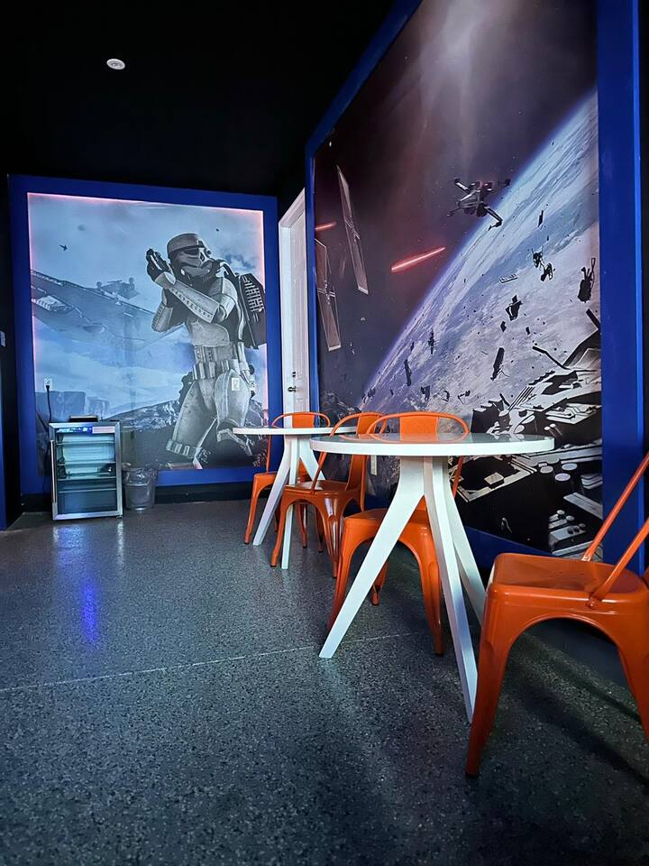 Designed by one of the best designers in the Orlando area, the Hollywood House accommodates both adults and kids alike. Fully renovated, EVERY room has its own unique theme whether just a chic look OR a popular theme. This house may not be for everyone but for those that like “well done” and being spoiled with amenities…this one is for you. Read on to understand why. This home is truly a FUN home with something for everyone. If you like to cook and/or grill, this home comes with a fully stocked kitchen and an outdoor grill (additional daily fee applies) so no need to wait for one to be delivered by an outside company. It will be there when you get there! Are you a movie buff? Experience our theatre room with a state-of-the-art sound system, plush seating and 70+ pre-loaded movies to pick from. How about hours of fun in the air-conditioned Arcade Room with all the popular arcade games you remember from years past and PS4? You also can enjoy our pleasant pool atmosphere or simply relax downstairs in the main living room, and pair your device to our Bose sound system for your enjoyment. Whether some in your group are looking for the “park scene” or the “stay behind scene”, this house will accommodate both agendas. If this isn’t enough… Solara Resort Club is open to our guests and has a state of the art surfing pool, kids play pool, everyone pool, restaurant, gym, outdoor bars, volleyball court, soccer field, and basketball court plus much more. Resort amenities, including clubhouse, pool, splash pad, and recreational facilities are managed by the HOA and maybe subject to temporary closures maintenance whether or limited hours without notice we are not able to guarantee availability. There are (2) King Suites on the first floor as well as (2) King Suites on the second floor. Themed rooms include: Avengers with (2) sets of Twin over Full bunk beds, Minnie Mouse themed room with (2) twin beds, and a Mickey & Friends bedroom with (2) twin beds. The adult rooms are identified by there unique style and a popular movie of the past. This home can sleep up to 16 people. The upstairs LOFT is where the brand-new THEATER is. The garage area was renovated into an ARCADE room featuring Pac Man, NBA Jam, Fast & Furious Super Bikes, 2021 Golden Tee Golf and Terminator Salvation. Log into your own PS4 account or use the games we’ve already downloaded. We LOVE our house and we hope you will as well. Here are some other amenities WE offer: • Fully stocked kitchen for dining plus toaster, blender, coffee maker etc. • Starter kit of Shampoo, bath soap, dish detergent, dish washer liquid, trash bags, paper towels • 3 rolls of toilet paper per bathroom • Use of washer and dryer • Outdoor Grill Available (additional fee applies) • Free Wifi • Clubhouse! • Owners that care about your experience Import things to note: ***We provide some basic house hold starter items to help get your trip started. Please note, for longer stays you may need to purchase additional supplies. We can heat the private pool and Hot Tub for 38$ a day. We can provide access to a propane grill for 12$/day. Important Rules: -This is not a party house, quiet hours will be strictly enforced. -Do not move any furniture or appliances. Nothing is to be moved or modified in the home. All persons MUST BE 25 years of age or older to stay in this property (this does not include children and young adults accompanied by their parents).