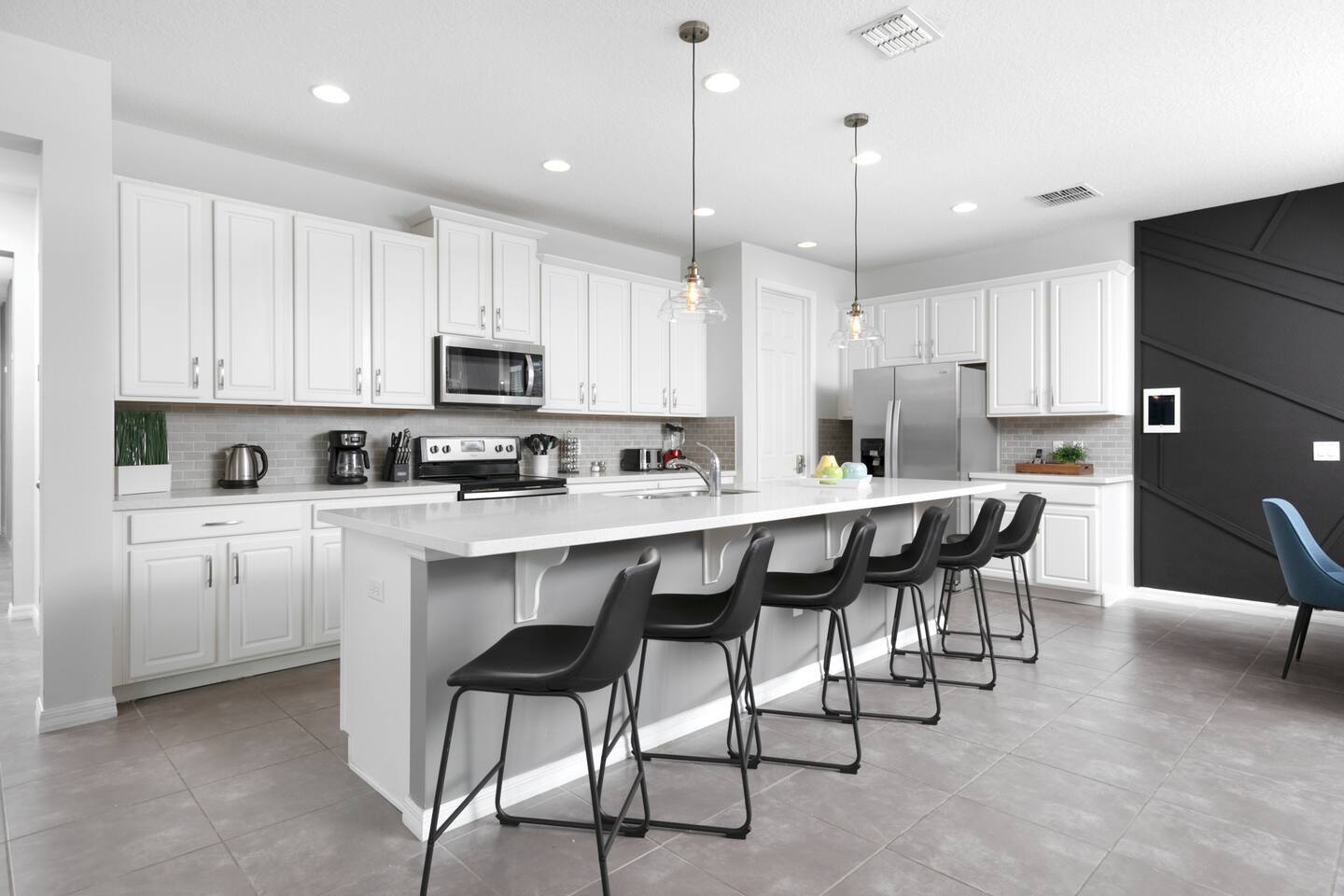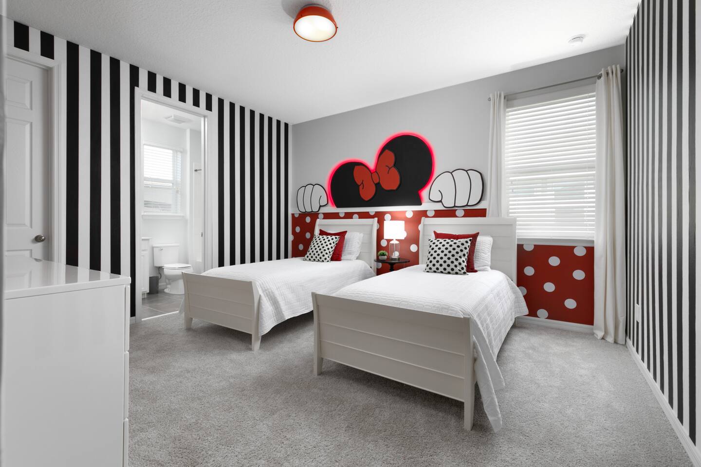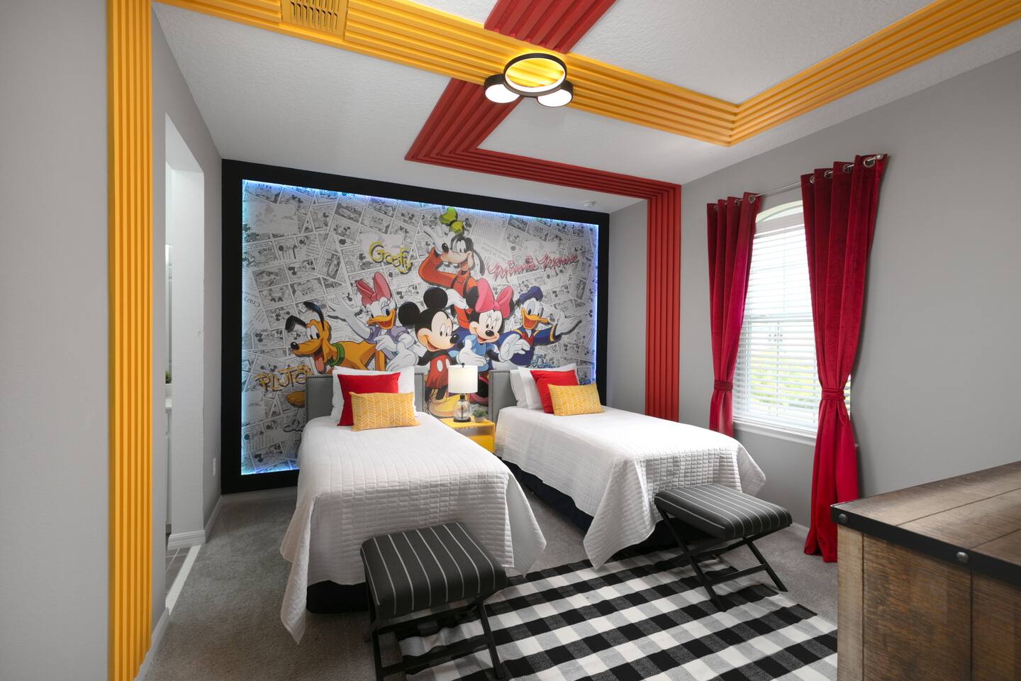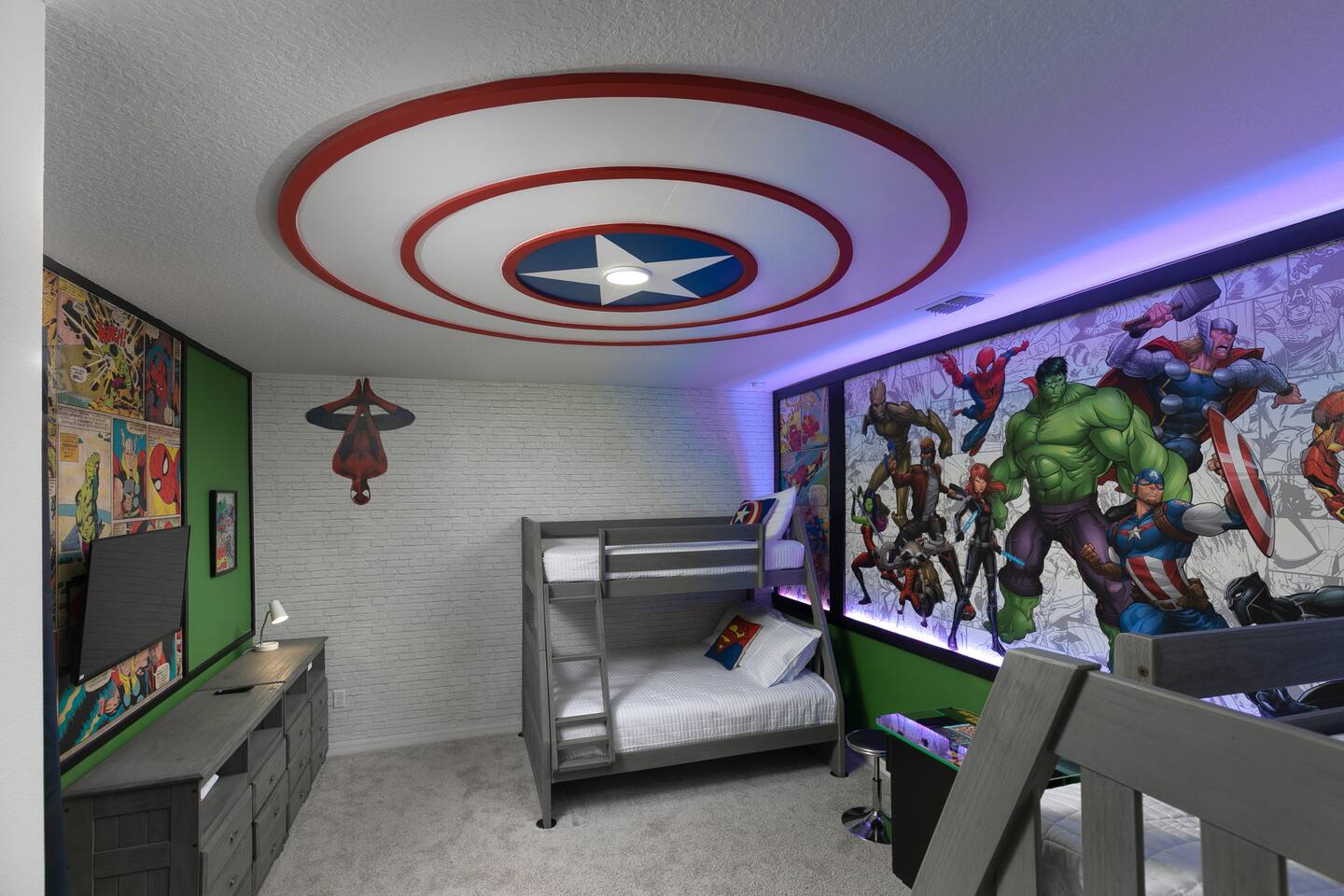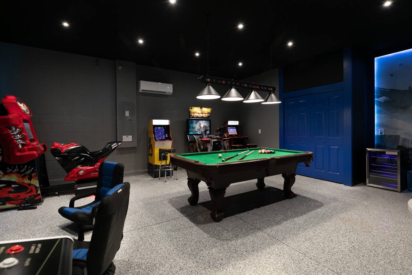 Designed by one of the best designers in the Orlando area, the Hollywood House accommodates both adults and kids alike. Fully renovated, EVERY room has its own unique theme whether just a chic look OR a popular theme. This house may not be for everyone but for those that like “well done” and being spoiled with amenities…this one is for you. Read on to understand why. This home is truly a FUN home with something for everyone. If you like to cook and/or grill, this home comes with a fully stocked kitchen and an outdoor grill (additional daily fee applies) so no need to wait for one to be delivered by an outside company. It will be there when you get there! Are you a movie buff? Experience our theatre room with a state-of-the-art sound system, plush seating and 70+ pre-loaded movies to pick from. How about hours of fun in the air-conditioned Arcade Room with all the popular arcade games you remember from years past and PS4? You also can enjoy our pleasant pool atmosphere or simply relax downstairs in the main living room, and pair your device to our Bose sound system for your enjoyment. Whether some in your group are looking for the “park scene” or the “stay behind scene”, this house will accommodate both agendas. If this isn’t enough… Solara Resort Club is open to our guests and has a state of the art surfing pool, kids play pool, everyone pool, restaurant, gym, outdoor bars, volleyball court, soccer field, and basketball court plus much more. Resort amenities, including clubhouse, pool, splash pad, and recreational facilities are managed by the HOA and maybe subject to temporary closures maintenance whether or limited hours without notice we are not able to guarantee availability. There are (2) King Suites on the first floor as well as (2) King Suites on the second floor. Themed rooms include: Avengers with (2) sets of Twin over Full bunk beds, Minnie Mouse themed room with (2) twin beds, and a Mickey & Friends bedroom with (2) twin beds. The adult rooms are identified by there unique style and a popular movie of the past. This home can sleep up to 16 people. The upstairs LOFT is where the brand-new THEATER is. The garage area was renovated into an ARCADE room featuring Pac Man, NBA Jam, Fast & Furious Super Bikes, 2021 Golden Tee Golf and Terminator Salvation. Log into your own PS4 account or use the games we’ve already downloaded. We LOVE our house and we hope you will as well. Here are some other amenities WE offer: • Fully stocked kitchen for dining plus toaster, blender, coffee maker etc. • Starter kit of Shampoo, bath soap, dish detergent, dish washer liquid, trash bags, paper towels • 3 rolls of toilet paper per bathroom • Use of washer and dryer • Outdoor Grill Available (additional fee applies) • Free Wifi • Clubhouse! • Owners that care about your experience Import things to note: ***We provide some basic house hold starter items to help get your trip started. Please note, for longer stays you may need to purchase additional supplies. We can heat the private pool and Hot Tub for 38$ a day. We can provide access to a propane grill for 12$/day. Important Rules: -This is not a party house, quiet hours will be strictly enforced. -Do not move any furniture or appliances. Nothing is to be moved or modified in the home. All persons MUST BE 25 years of age or older to stay in this property (this does not include children and young adults accompanied by their parents).